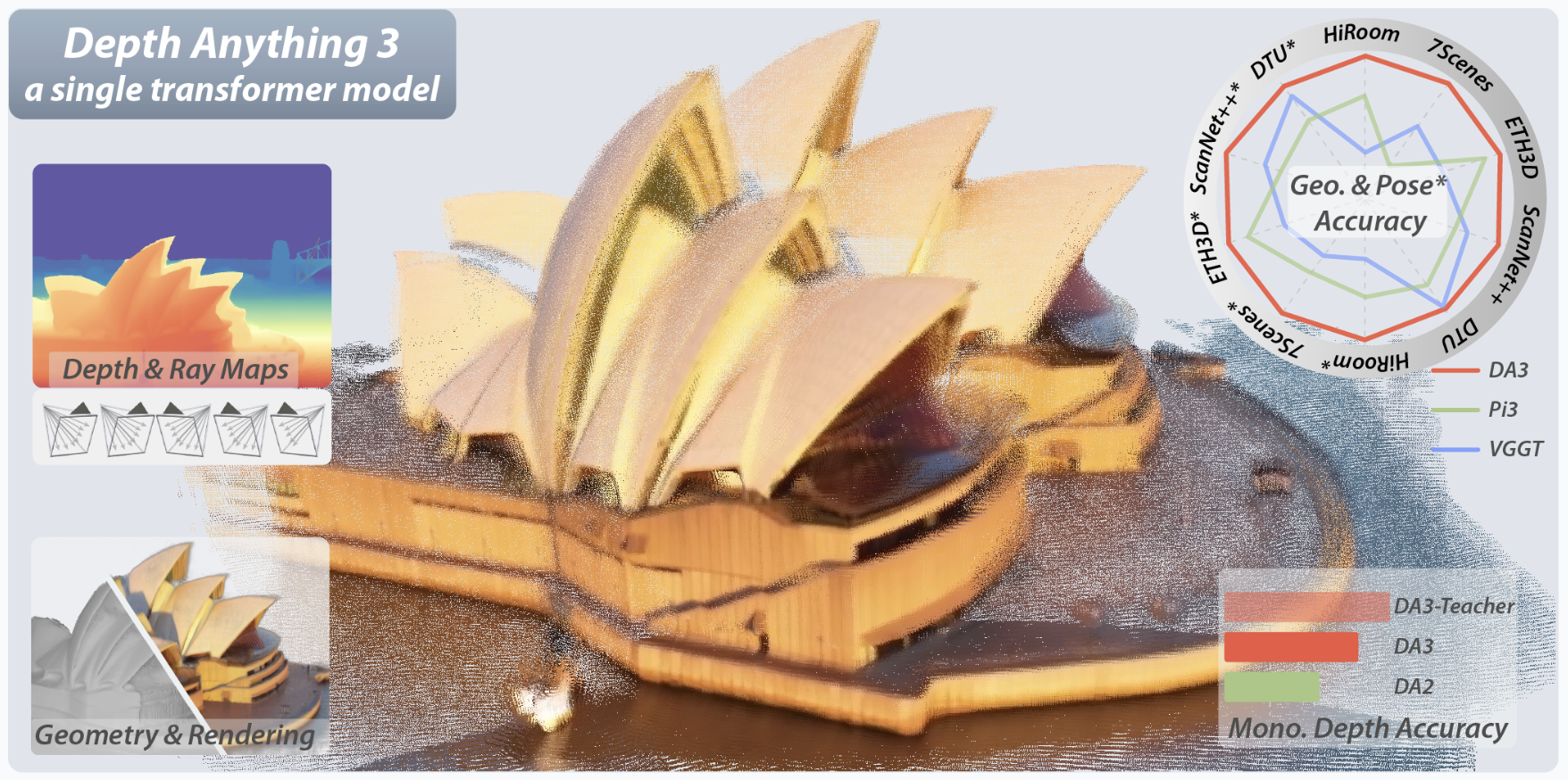 Depth Anything 3: Recovering the Visual Space from Any Views Haotong Lin, Sili Chen, Hao Liew Jun, Y. Chen Donny, Zhenyu Li, Guang Shi, Jiashi Feng, Bingyi Kang Arxiv, 2025 [Project Page] [PDF] [Code] |