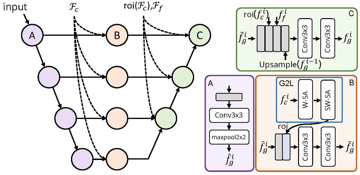 While the key insight of G2L is to apply the global-wise self attention for each-level feature from Coarse Network to ensemble crucial information for patch-wise scale-consistent prediction,